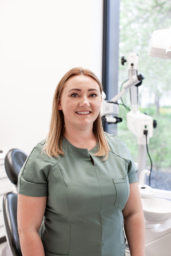 Higienistė Evelina atlieka profesionalias burnos higienas bei dantų spalvos korekcijas su Beyond Polus Advanced lempa kabinete.